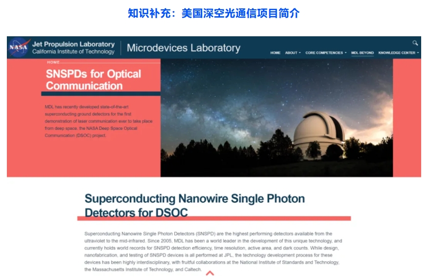 SNSPD是從紫外到中紅外范圍內(nèi)綜合性能最優(yōu)的單光子探測器,因此成為美國國家航空航天局(NASA)和噴氣推進實驗室(JPL)深空光通信(Deep Space Optical Communications,DSOC)項目的重要支撐研發(fā)項目。自2005年以來,MDL在這一獨特技術(shù)的開發(fā)方面一直處于世界領(lǐng)先地位,并且在探測效率、時間分辨率、有效面積和暗計數(shù)方面保持著世界紀(jì)錄。